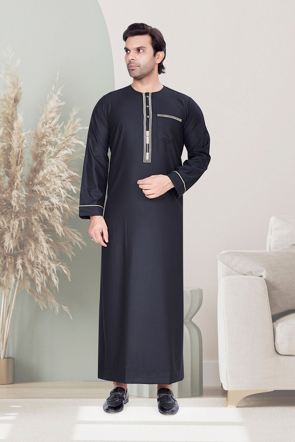 Authentic Omani-Inspired Machine Embroidery: Precision-crafted embroidery on the collar and chest for a clean, elegant look.